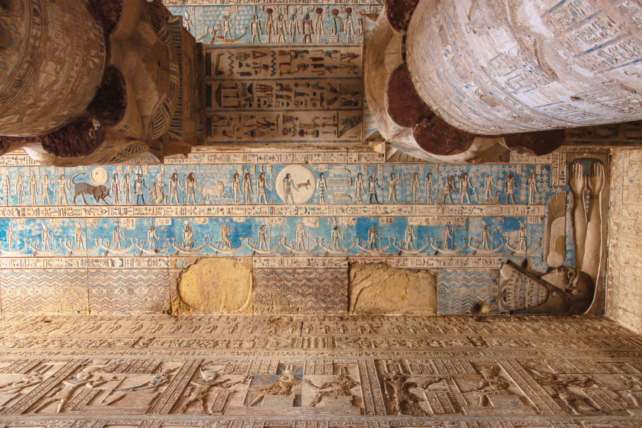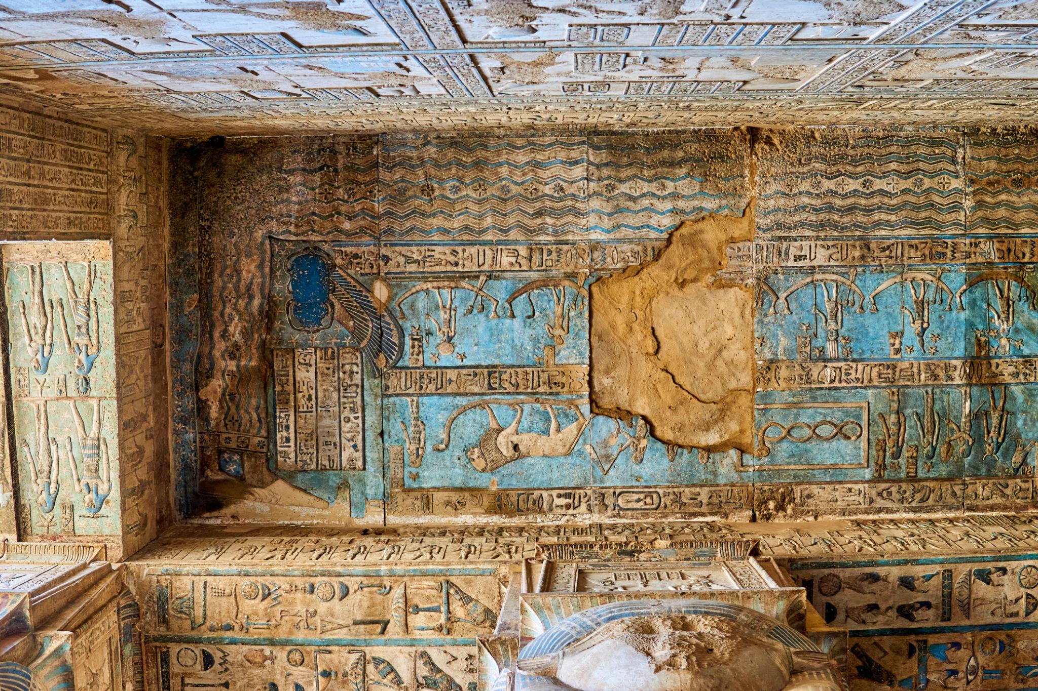 The Temple of Hathor at Dendera features intricate astronomical ceilings vividly depicting