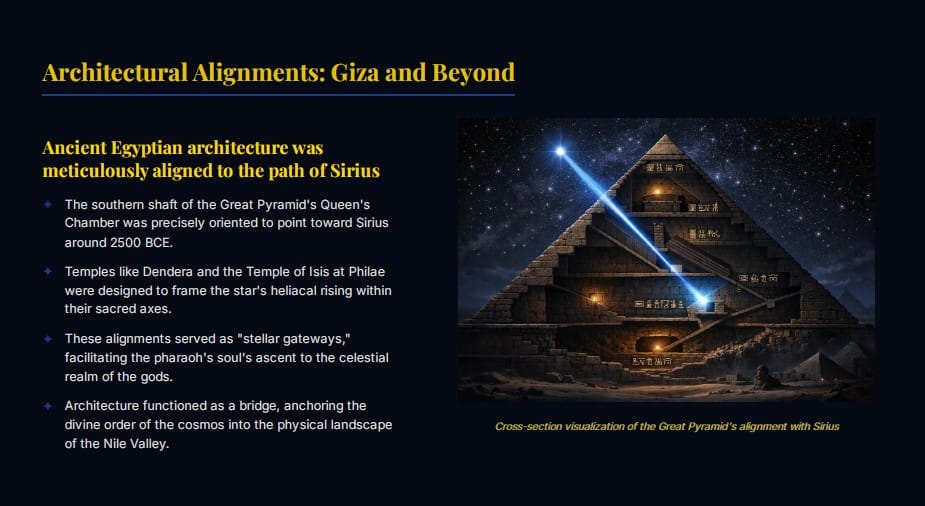 Beyond Giza and Dendera, numerous other temples across Egypt, including Abydos and Edfu, exhibit deliberate architectural alignments meticulously designed to frame Sirius during its heliacal rising [1]. These precise orientations were the culmination of centuries of astronomical observation and sophisticated engineering. Such architectural feats unequivocally reveal the ancient Egyptians’ profound and advanced astronomical knowledge, demonstrating their ability to integrate celestial phenomena into the very fabric of their sacred spaces. More importantly, these alignments underscore their unwavering devotion to Sirius, recognizing it as a divine entity that governed the rhythms of their world and held the key to cosmic understanding.