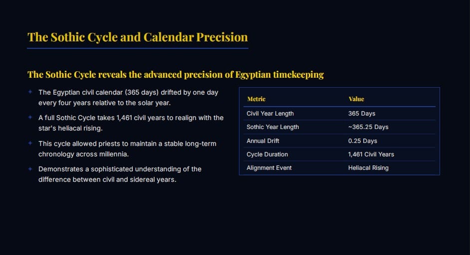This led to the Sothic cycle, a grand celestial period of 1,461 Egyptian civil years (365 days